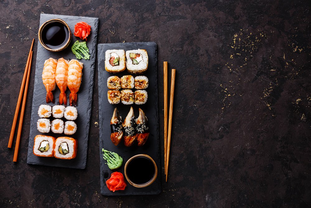 Sushi met komkommer, roomkaas, , zalm, tonijn en avocado